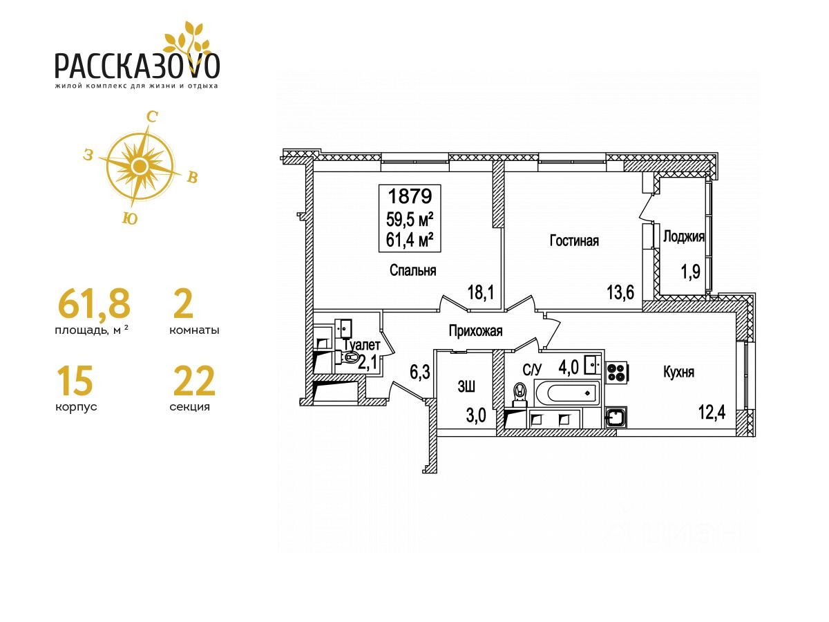 Продается 2-комнатная квартира в ЖК Рассказово на 11 этаже. Общая площадь квартиры составляет 61,8 кв.м. Квартира без отделки.