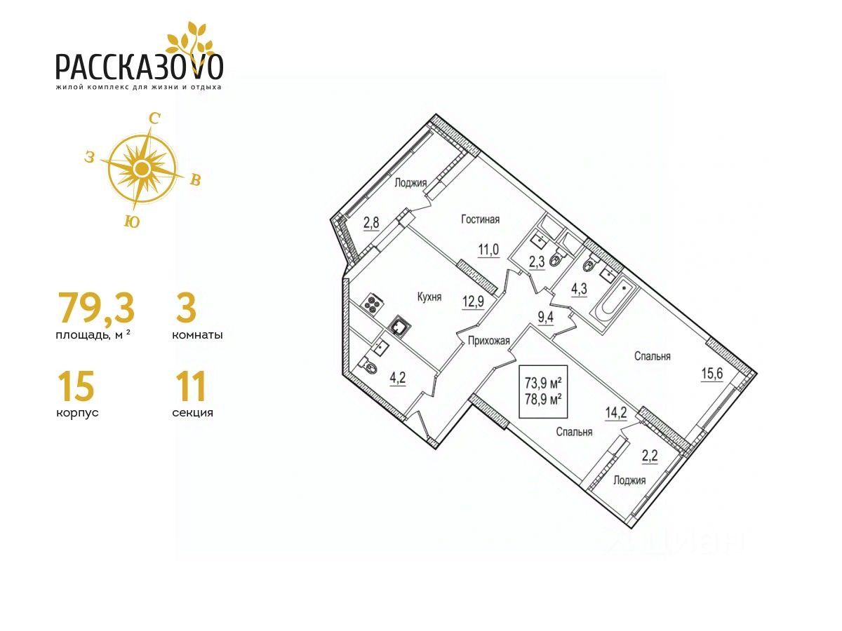 Продается 3-комнатная квартира в ЖК Рассказово на 14 этаже. Общая площадь квартиры составляет 79,3 кв.м. Квартира без отделки.