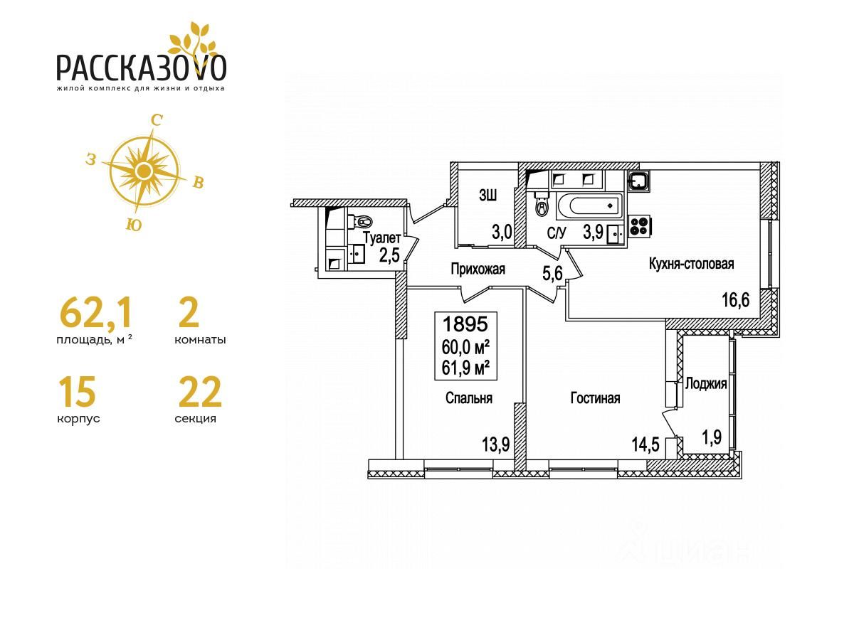 Продается 2-комнатная квартира в ЖК Рассказово на 14 этаже. Общая площадь квартиры составляет 62,1 кв.м. Квартира без отделки.