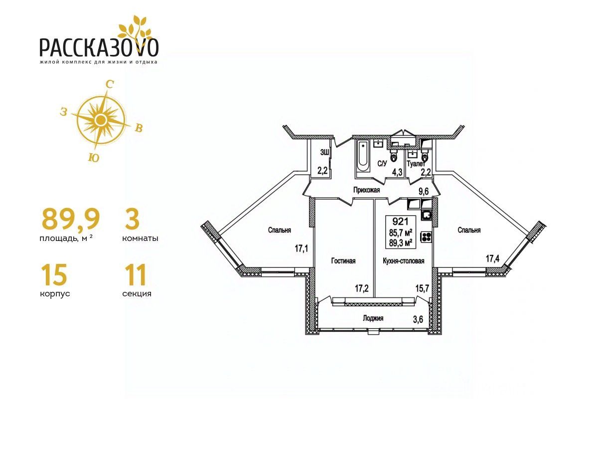 Продается 3-комнатная квартира в ЖК Рассказово на 14 этаже. Общая площадь квартиры составляет 89,9 кв.м. Квартира без отделки.