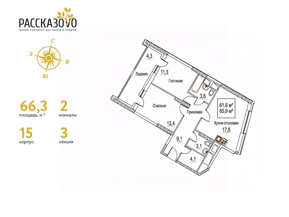 Продается 2-комнатная квартира в ЖК Рассказово на 21 этаже. Общая площадь квартиры составляет 66,3 кв.м. Квартира без отделки.