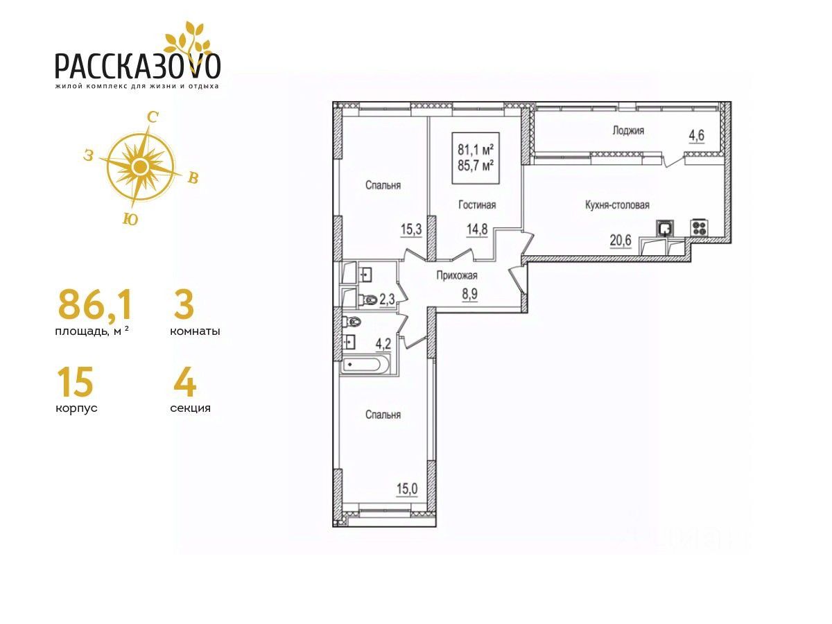 Продается 3-комнатная квартира в ЖК Рассказово на 18 этаже. Общая площадь квартиры составляет 86,1 кв.м. Квартира без отделки.