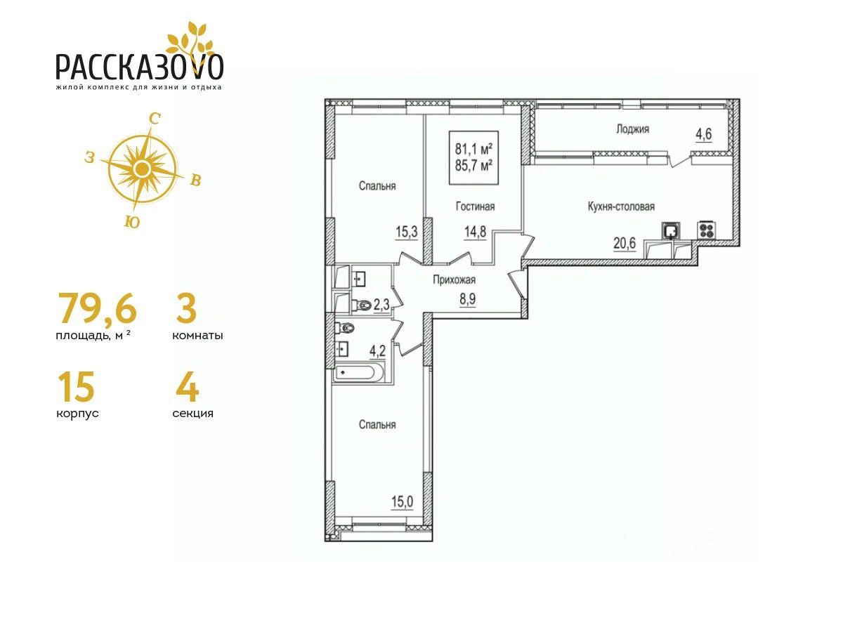 Продается 3-комнатная квартира в ЖК Рассказово на 19 этаже. Общая площадь квартиры составляет 85,9 кв.м. Квартира без отделки.