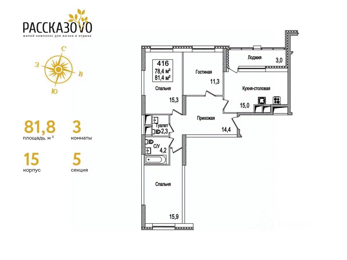Продается 3-комнатная квартира в ЖК Рассказово на 15 этаже. Общая площадь квартиры составляет 81,8 кв.м. Квартира без отделки.