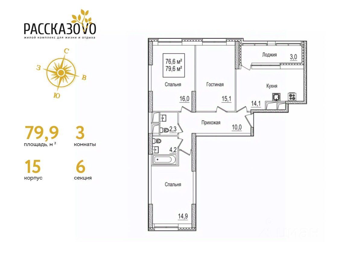 Продается 3-комнатная квартира в ЖК Рассказово на 20 этаже. Общая площадь квартиры составляет 79,9 кв.м. Квартира без отделки.