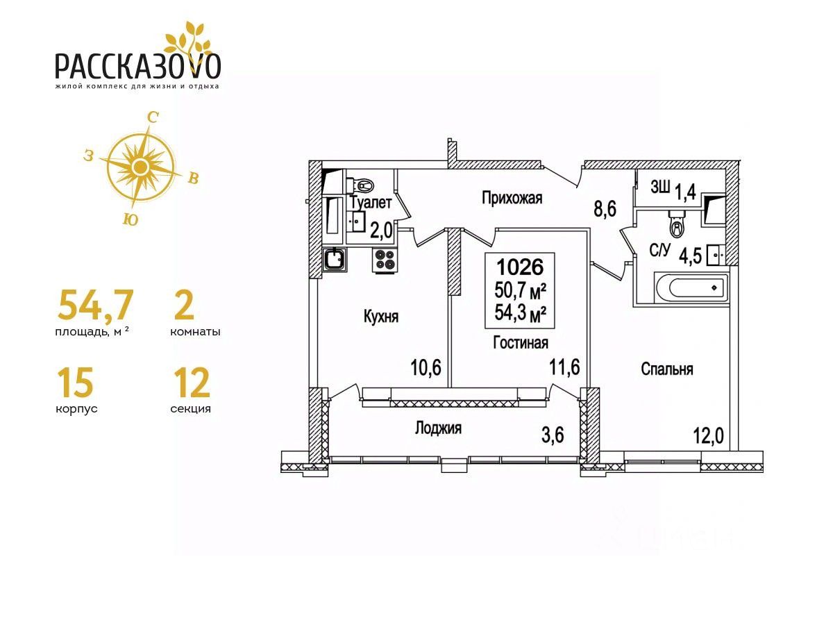 Продается 2-комнатная квартира в ЖК Рассказово на 16 этаже. Общая площадь квартиры составляет 54,7 кв.м. Квартира без отделки.