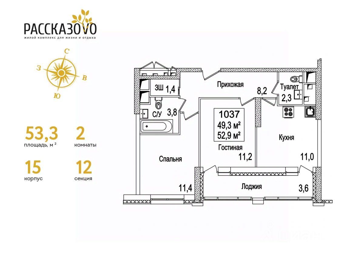 Продается 2-комнатная квартира в ЖК Рассказово на 19 этаже. Общая площадь квартиры составляет 53,3 кв.м. Квартира без отделки.