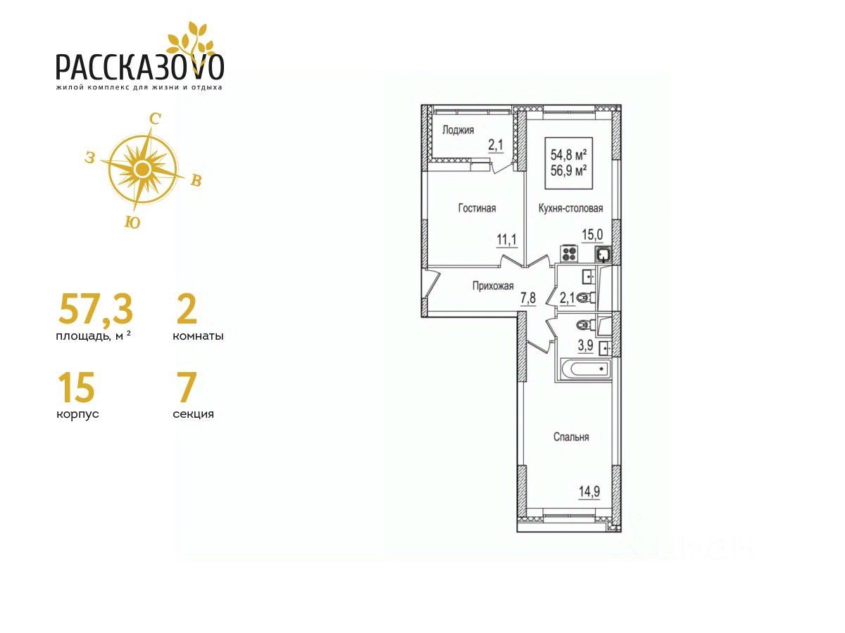 Общая площадь57,3 м2