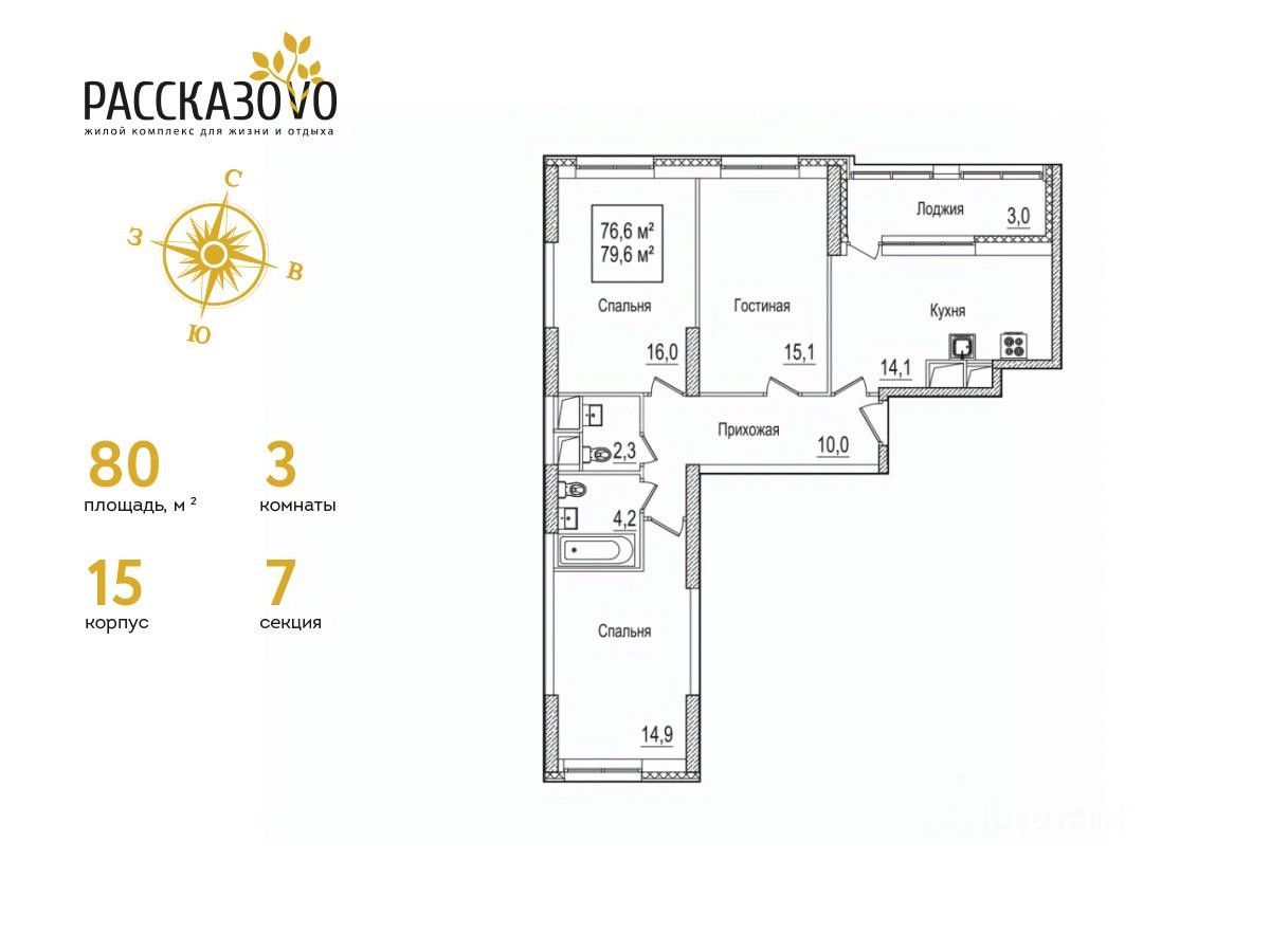 Продается 3-комнатная квартира в ЖК Рассказово на 20 этаже. Общая площадь квартиры составляет 80 кв.м. Квартира без отделки.
