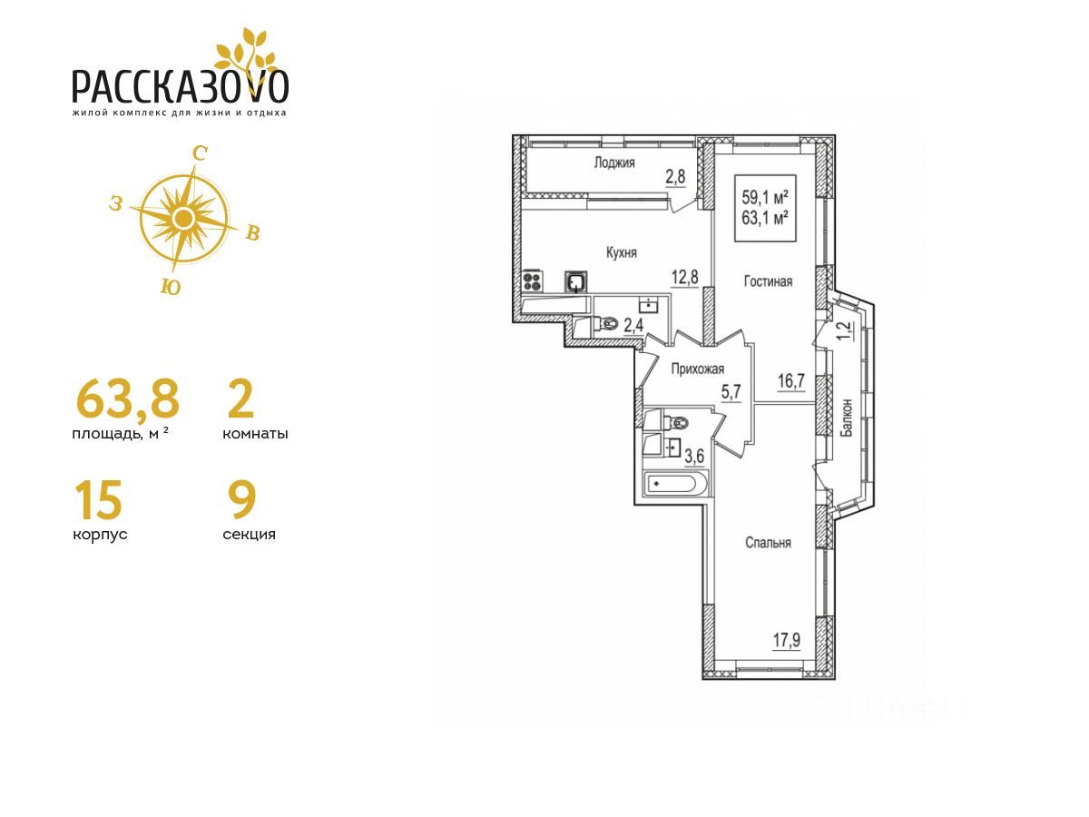 Продается 2-комнатная квартира в ЖК Рассказово на 16 этаже. Общая площадь квартиры составляет 63,8 кв.м. Квартира без отделки.