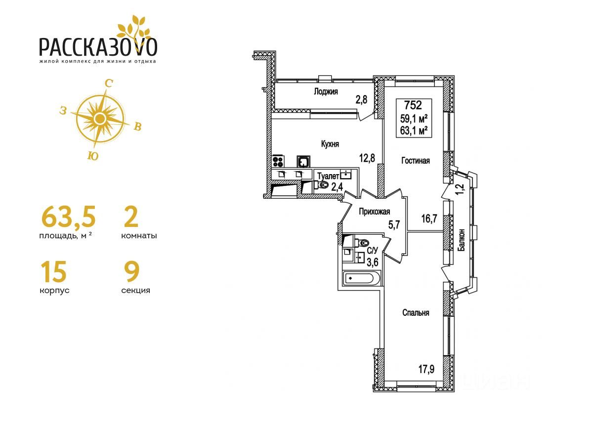 Продается 2-комнатная квартира в ЖК Рассказово на 17 этаже. Общая площадь квартиры составляет 63,5 кв.м. Квартира без отделки.