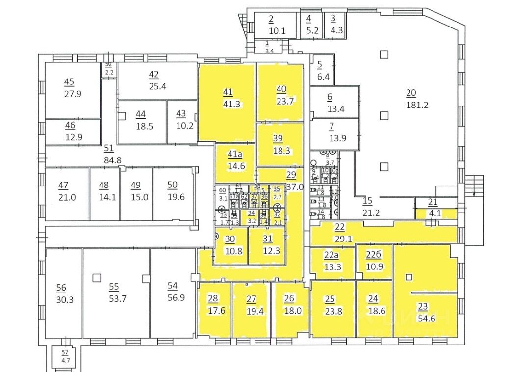 Помещение с отдельным входом и разбито на несколько кабинетов (54,6 кв.м., 41,3 кв.м., 23,8 кв.м., 19,4 кв.м., 17,6 кв.м., 18,3 кв.м., 14,6 кв.м., 13,4 кв.м., 10,9 кв.м., складские помещения (23,7 + 12,3 кв.м.), серверная, кухня 10,8 кв.м., а так же 3 с/у.