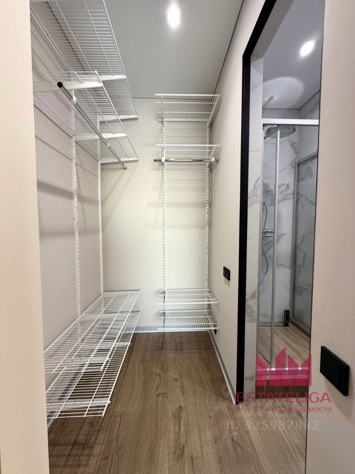 Планировка квартиры - кухня + гостиная, гостевой санузел, гардеробная, + мастер спальня с санузлом, гардеробной + кабинет. В квартире сделан качественный ремонт. Произведена замена сантехники - новые трубы + датчики протечки Neptun. В прихожей обустроенная гардеробная. Кухня полностью оборудована - обеденный стол, кухонный гарнитур с духовым шкафом, микроволновой печью, индукционной плитой, вытяжкой, посудомойка, холодильник. Много мест для хранения. В квартире два санузла. Один гостевой + мастер спальня.