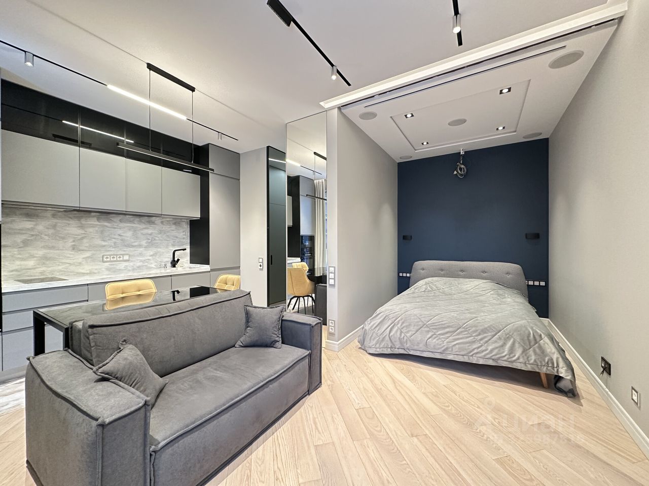 Просторная студия 37,6 кв. м. с авторским евроремонтом, выполненным по индивидуальному дизайн-проекту. Здесь продумана каждая деталь. Пространство зонировано на уютную спальную зону, просторную гостиную и функциональную кухню с современной техникой известных брендов (холодильник, варочная панель, духовой шкаф, посудомоечная машина, вытяжка).