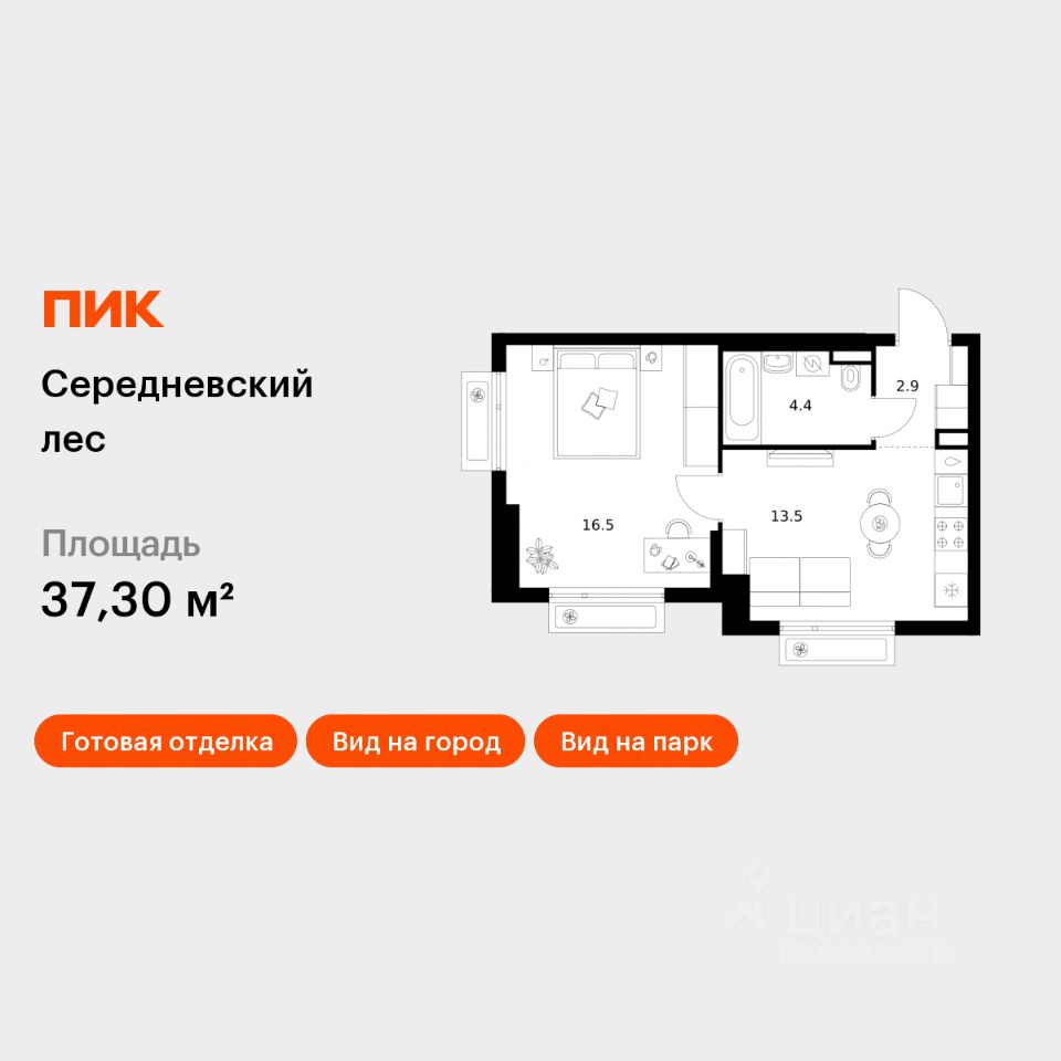 Продаётся 1-комн. квартира площадью 37,3 кв.м на 14 этаже 16 этажного дома (Корпус 2.1.1, Секция 1) проекта ПИК Середневский лес. Светлый просторный подъезд на уровне земли, функциональная планировка, большие окна, c отделкой.