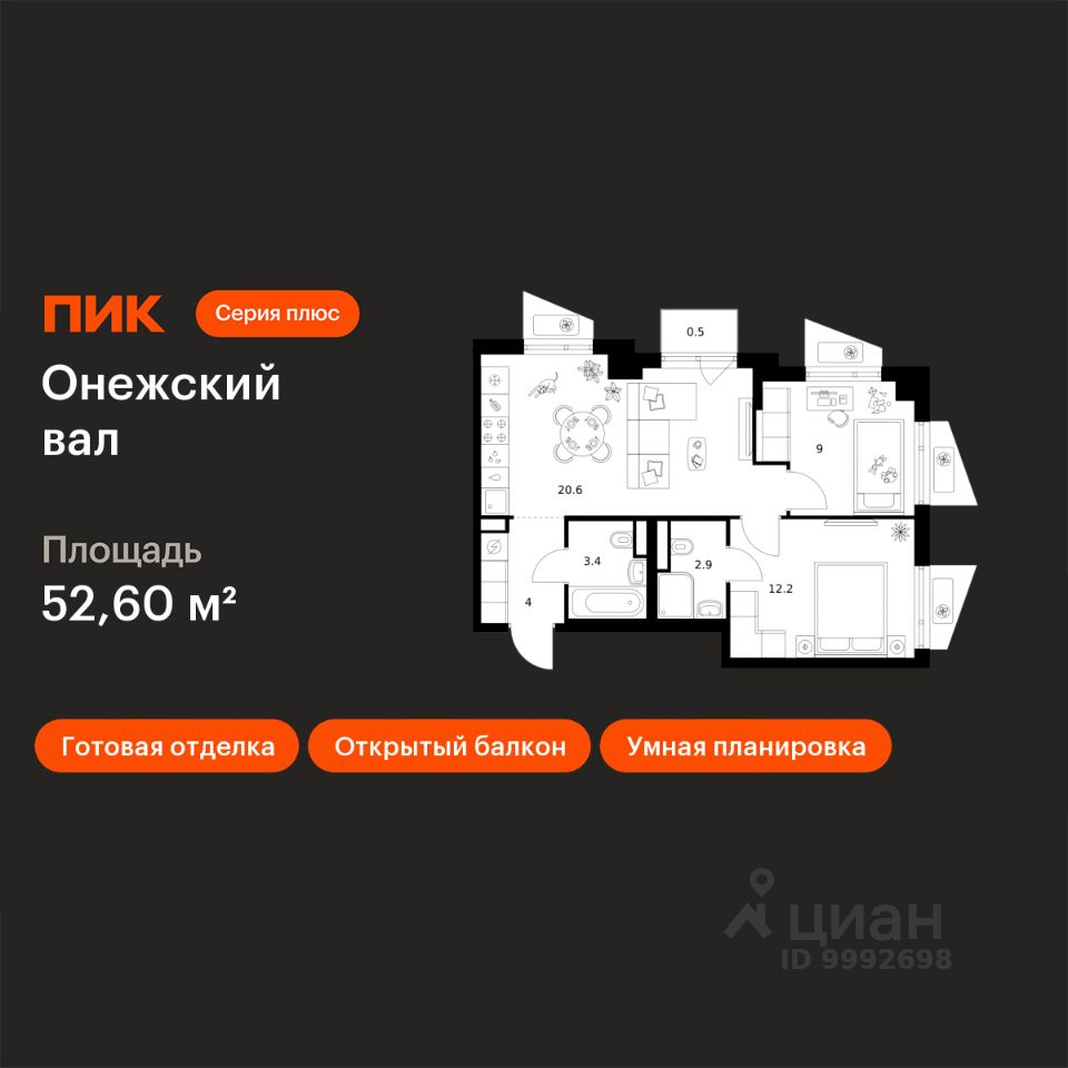 Новостройка! Продается 2-комн. кв-ра площадью 52,6 кв.м, (Корпус 1.1.6, Секция 6) 7 этаж 9-этажного дома в Онежский вал от ПИК. Квартал ''Серии плюс'' строится на севере Москвы, в 10 минутах пешком от станции метро ''Селигерская'' и МЦД ''Моссельмаш''. Проект понравится всем, кто привык к комфортной жизни и ценит возможность оставаться в ритме большого города и быстро добираться до центра столицы. Концепция проекта связывает квартал с природой Русского Севера. В проекте три акцентные башни с террасами и контрастными фасадами из матовой плитки и металла. Корпуса разной этажности повторяют силуэты хвойных деревьев, а архитектурные элементы на фасадах — напоминают природные рисунки скал. Блестящие алюминиевые панели в тон матовой плитке создают игру текстур на верхушках корпусов.