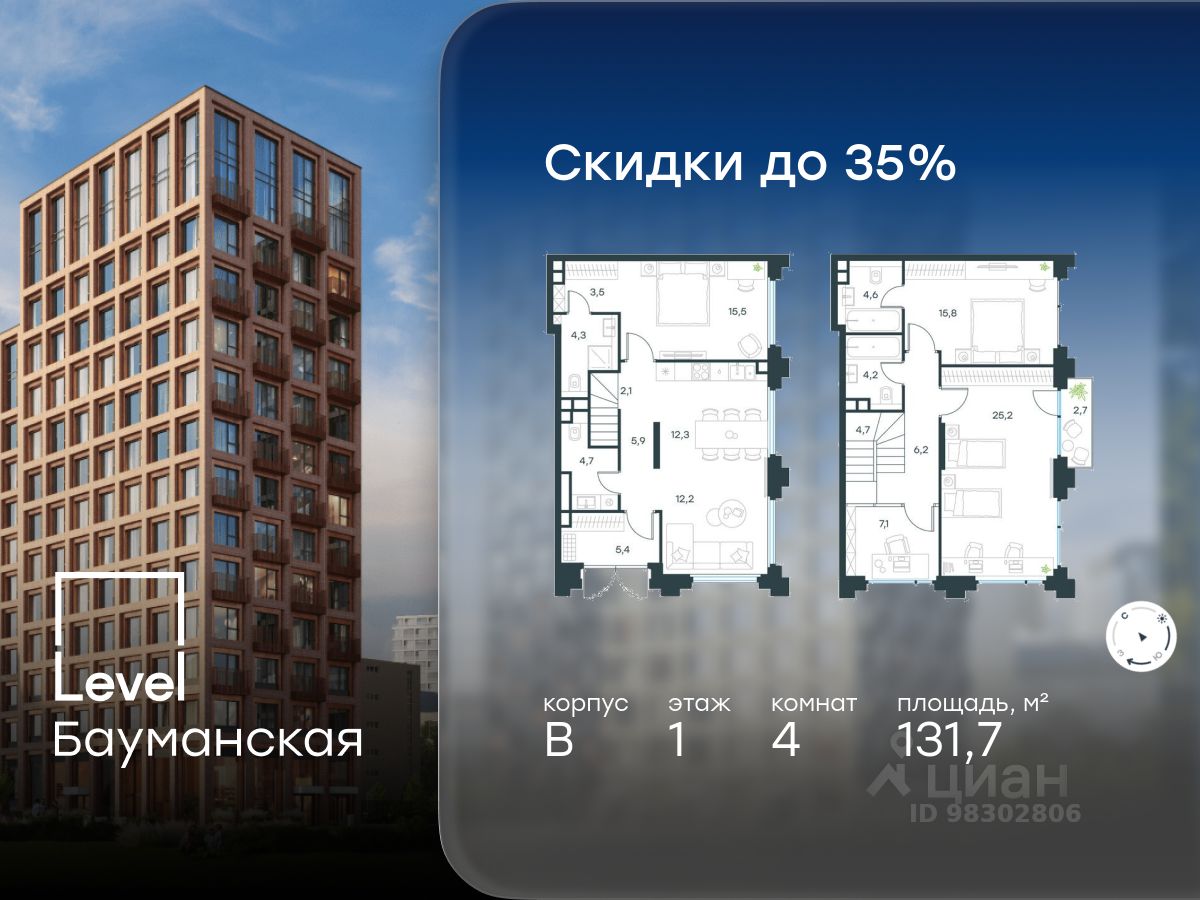 В Басманном районе (ЦАО) продается 4-комнатная квартира площадью 131.70 кв.м без отделки. Квартира расположена на 1 этаже 17-этажного корпуса '' B'' в жилом комплексе бизнес-класса Level Бауманская (компания Level Group).