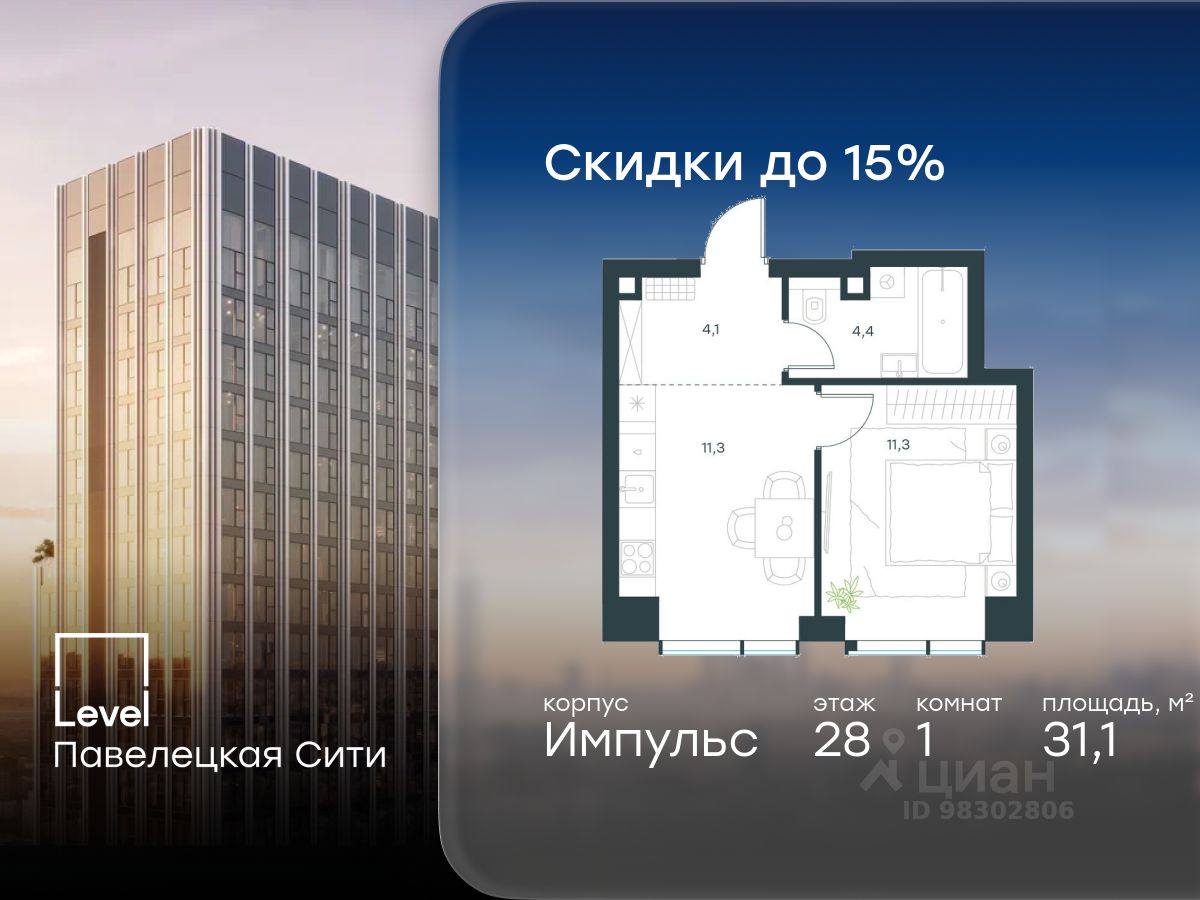 В Даниловском районе столицы (ЮАО) продаётся 1-комнатная квартира площадью 31.10 кв.м без отделки. Квартира расположена на 28 этаже 45-этажного корпуса 'Горизонт' в жилом комплексе бизнес-класса Level Павелецкая Сити. Высота потолков 3.00м.