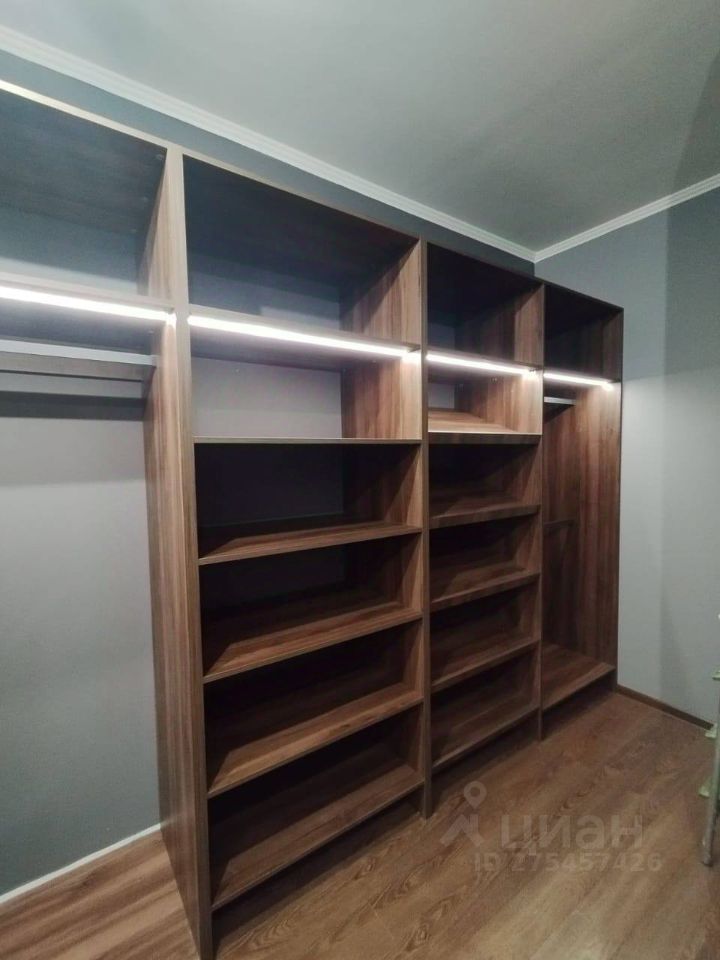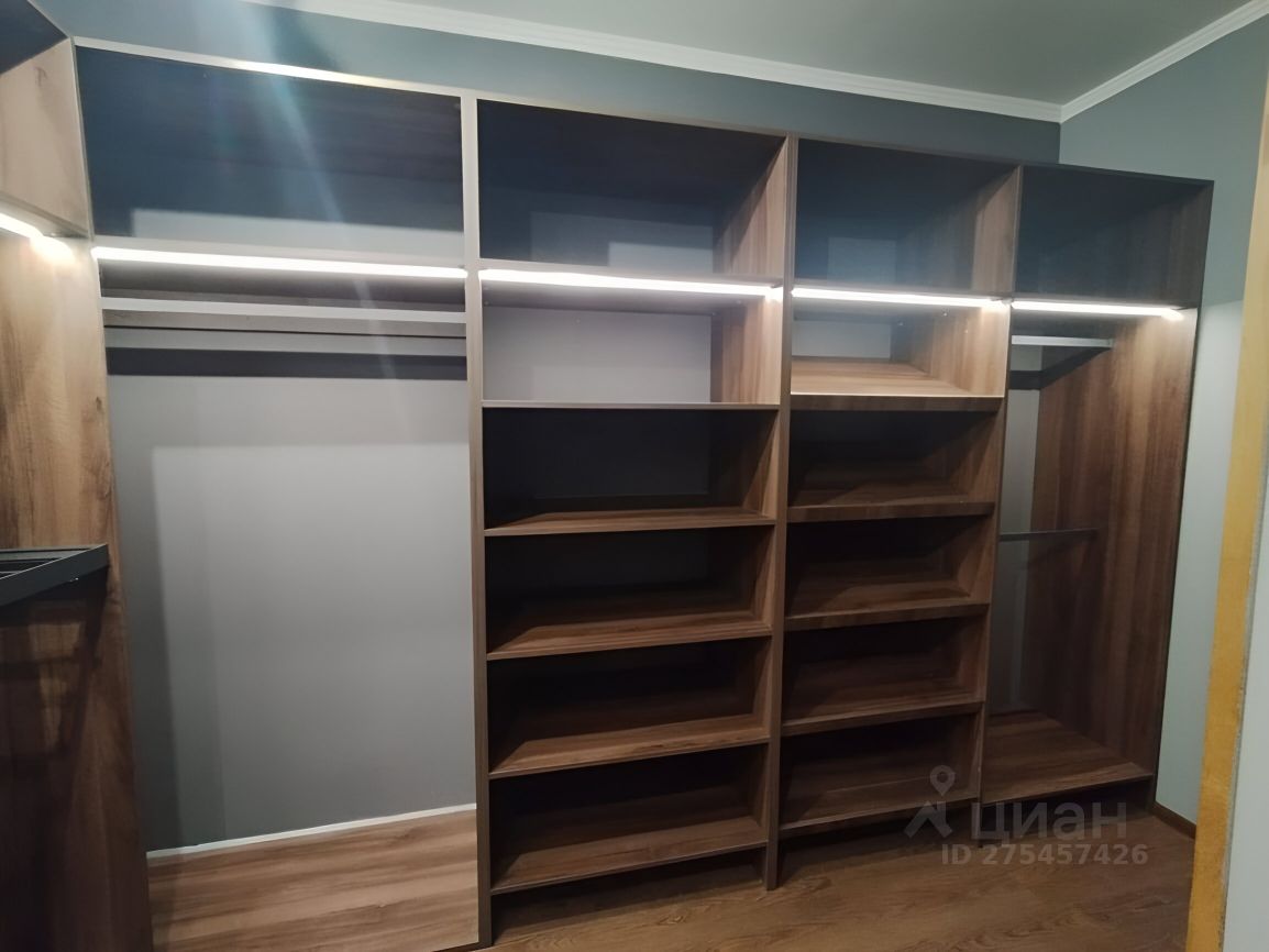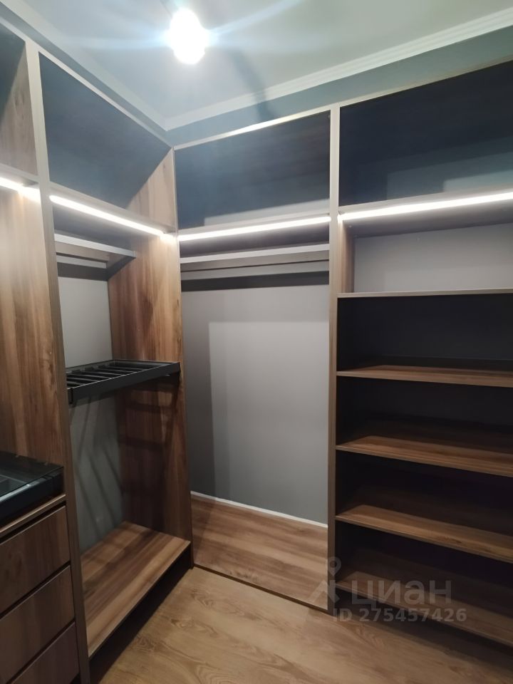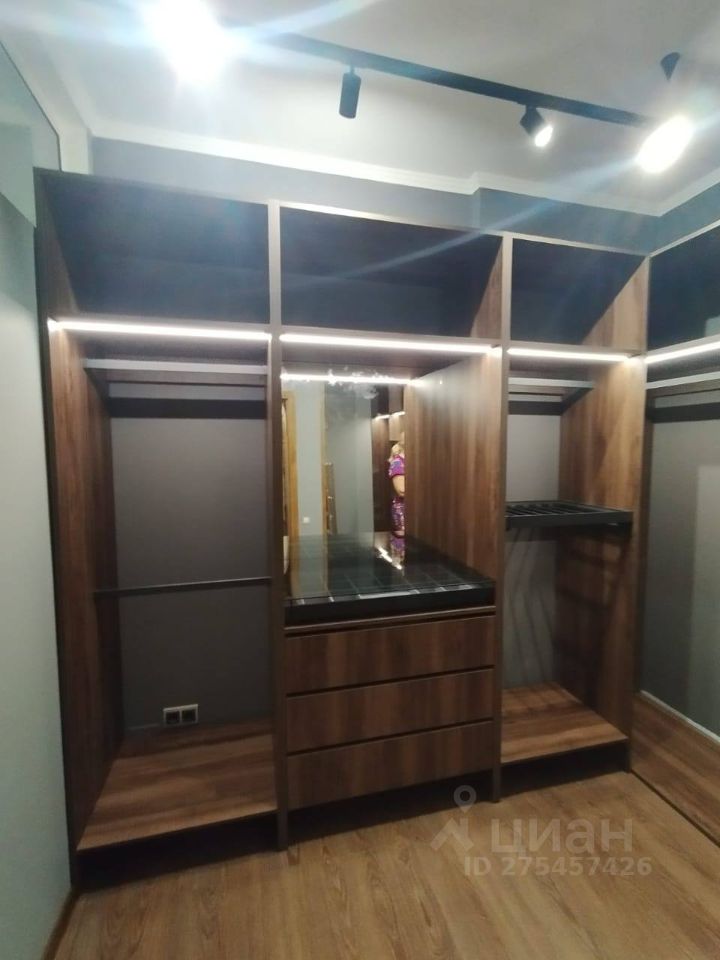 Полноценная гардеробная, в которой журнальный стол-витрина, зеркало в пол, шкафы для обуви, рубашек, верхней одежды, постельного белья.