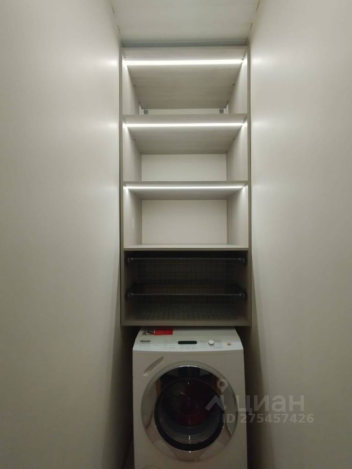 Оборудованная кладовая с стиральной машиной MIELE, полками для белья, порошков и иных домашних принадлежностей.