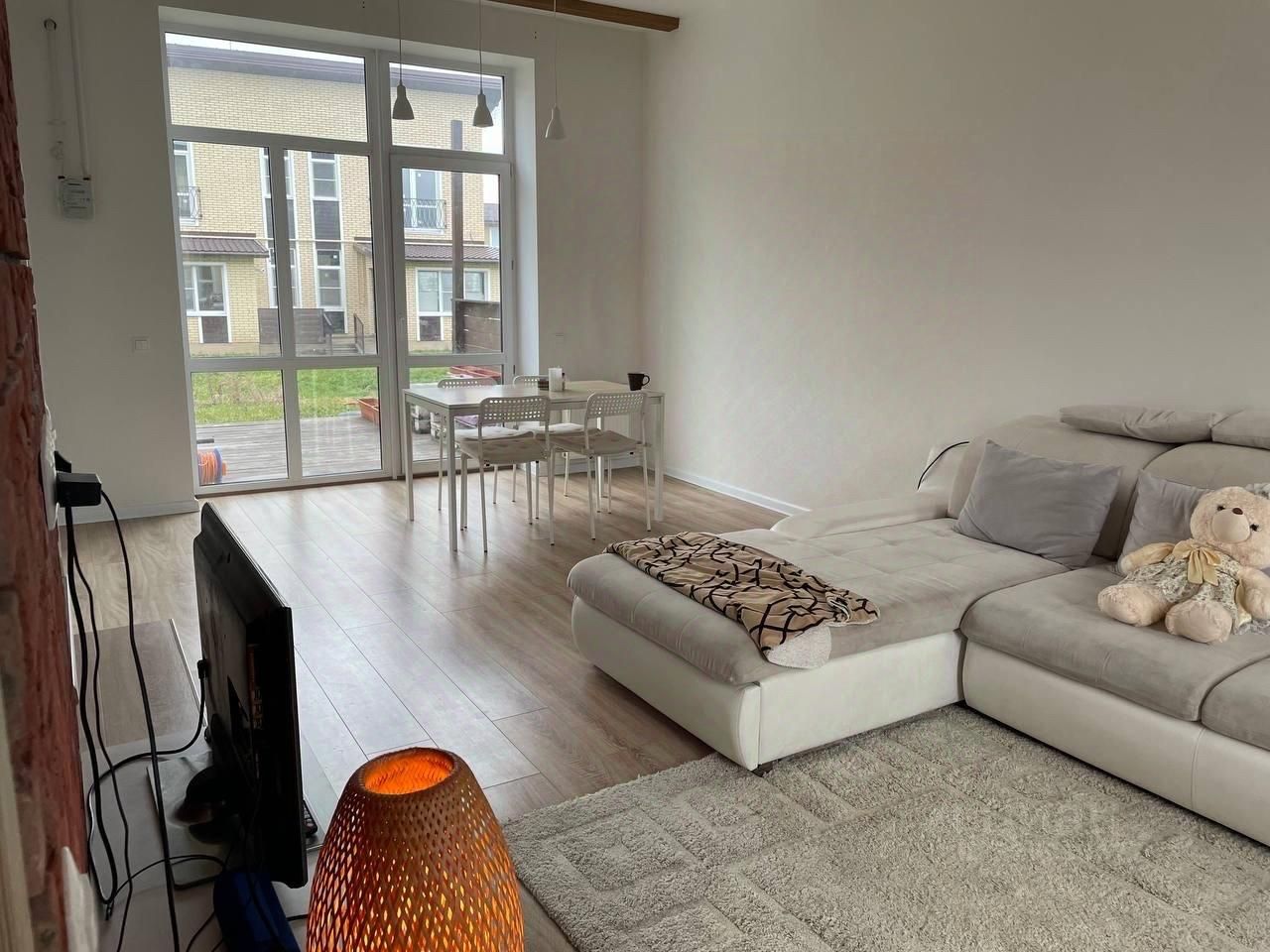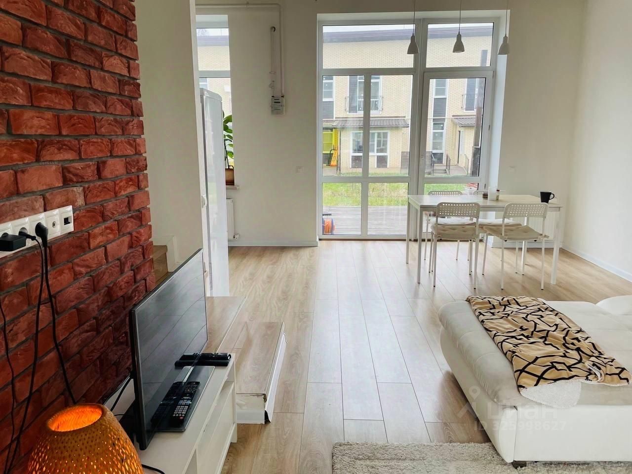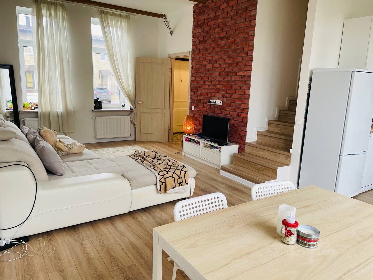 Светлый уютный таунхаус. На первом этаже санузел и кухня-гостиная. На втором этаже две спальни и ванна. Есть вся необходимая мебель.