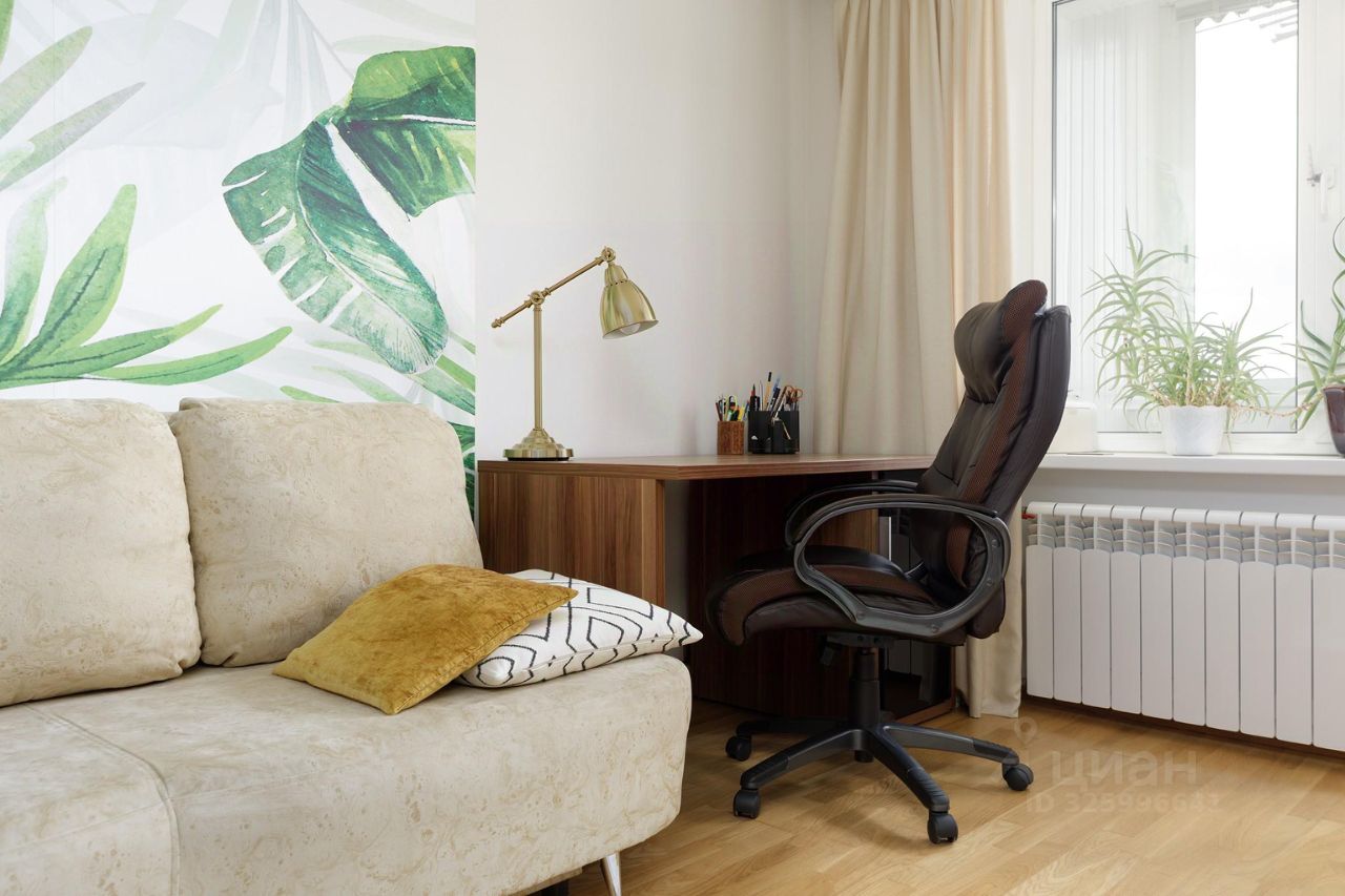 В бОльшей комнате создана атмосфера домашнего оазиса. Есть рабочая зона с добротным столом, комфортным креслом и гостиная зона с бежевым раскладным диваном, туалетным столиком с зеркалом. Большой шкаф-купе, кондиционер, из комнаты выход на застекленный балкон.