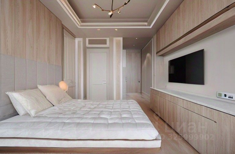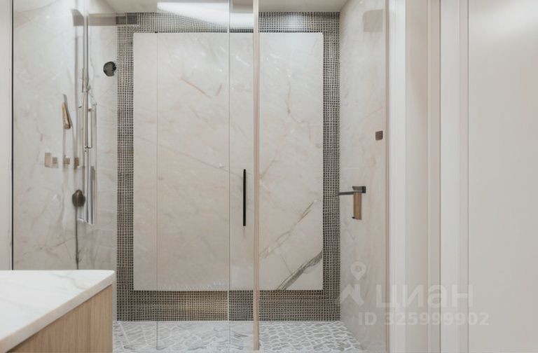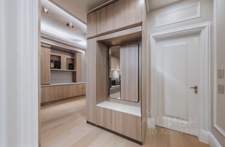 В квартире выполнена высококачественная отделка в теплых пастельных тонах с использованием премиальных материалов. Интерьер дополняют декоративная шелковая штукатурка, крупноформатный керамогранит и мраморные подоконники. Высокие потолки (3,2 м) и двери (2,3 м) создают ощущение исключительного пространства.
