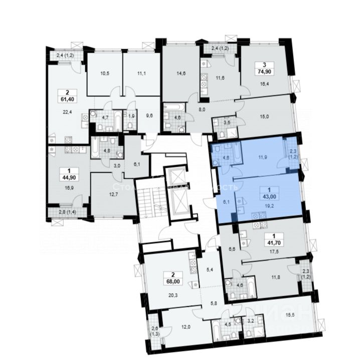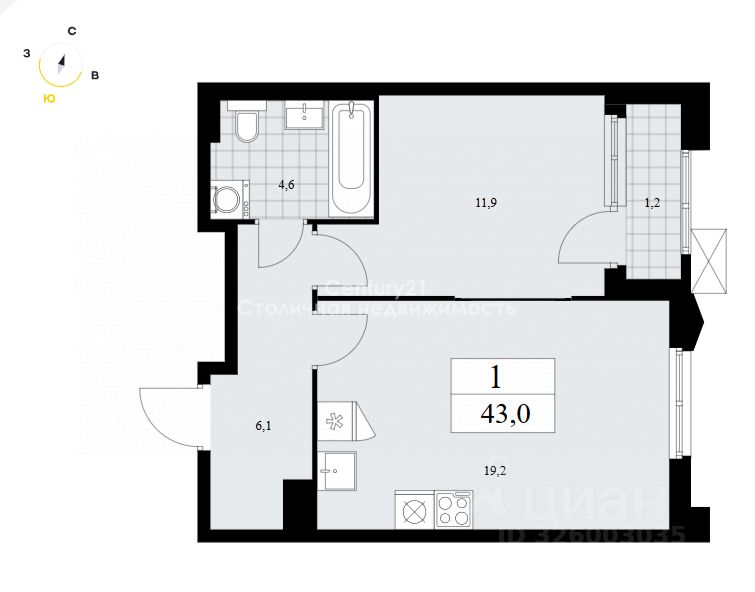 Информация об объекте: Общая площадь: 43 кв.м. Жилая площадь: 11.9 кв.м. Площадь кухни: 19.2 кв.м. Структура комнат: изолированные, сан.