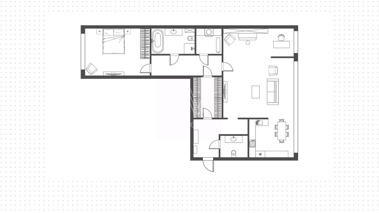 Планировкой предусмотрено: гостиная с рабочим пространством, кухня с обеденной зоной, спальня, вместительная проходная гардеробная, два санузла. Установлена приточно-вытяжная система вентиляции и кондиционирования, стиральная машина с режимом сушки, подогрев полов.