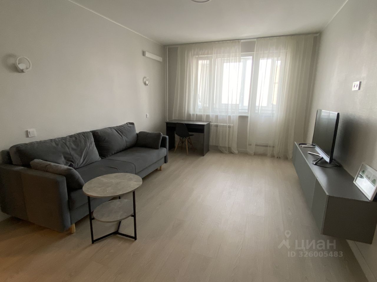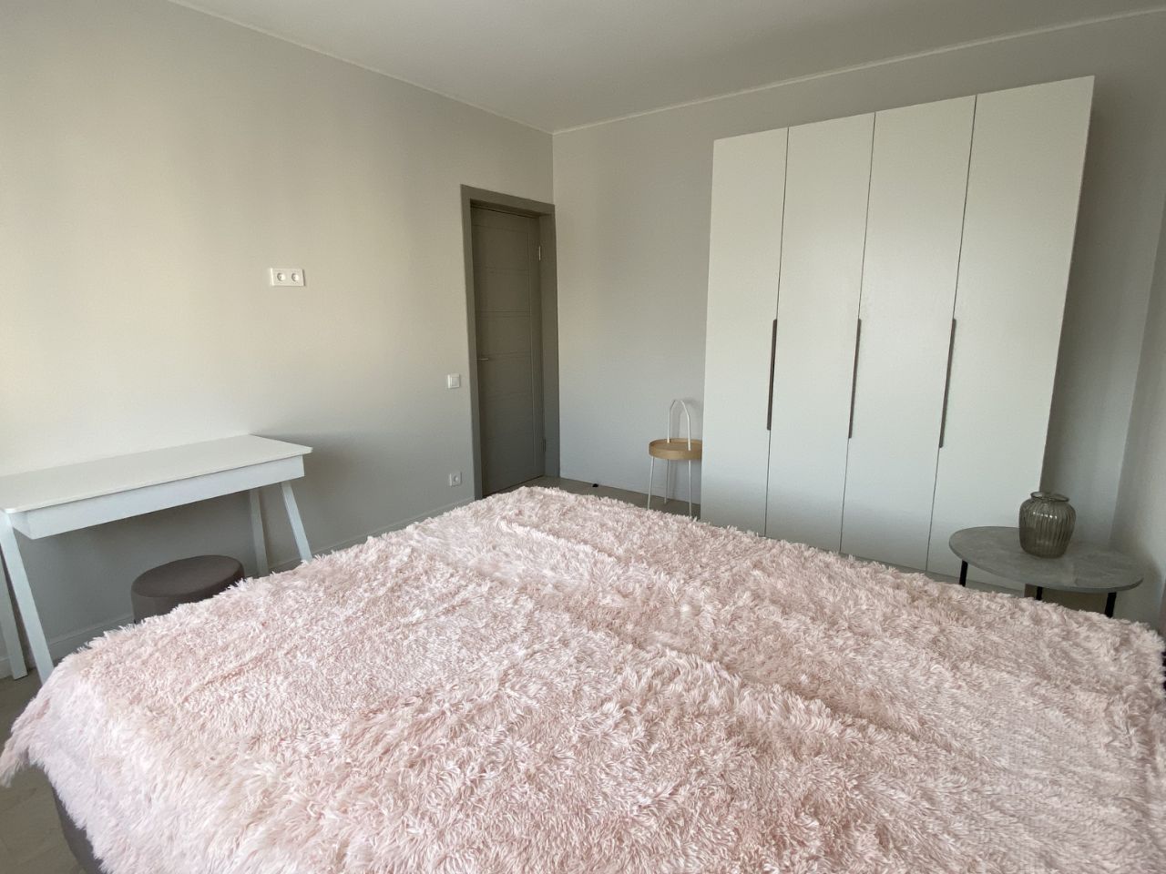 Двухспальная кровать и раскладной диван, вместительные шкафы в прихожей и спальне.