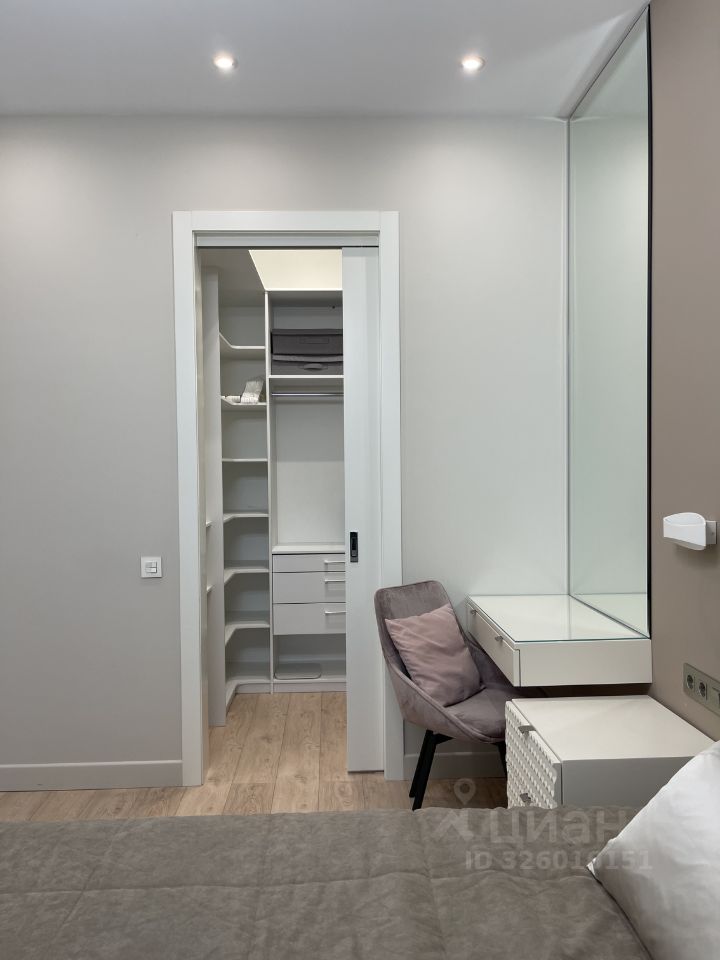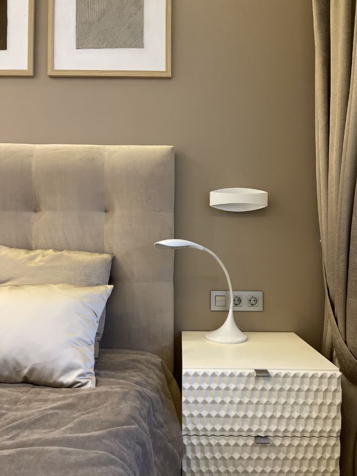Современный элегантный дизайн, натуральные материалы в отделке, встроенные системы хранения, разные сценарии освещения.