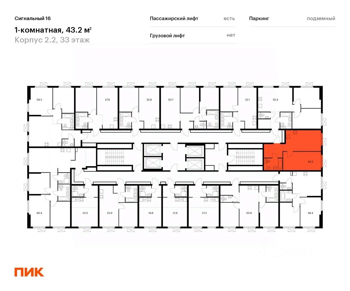 Продаётся 1-комн. квартира площадью 43,2 кв.м на 33 этаже 33 этажного дома (Корпус 2.2, Секция 4) проекта ПИК Сигнальный 16. Светлый просторный подъезд на уровне земли, функциональная планировка, большие окна, c отделкой.