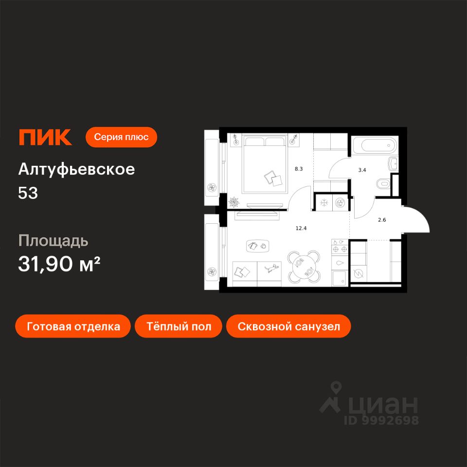 Продаётся 1-комн. квартира площадью 31,9 кв.м на 12 этаже 32 этажного дома (Корпус 1.1, Секция 4) проекта ПИК Алтуфьевское 53. Светлый просторный подъезд на уровне земли, функциональная планировка, большие окна, c отделкой.
