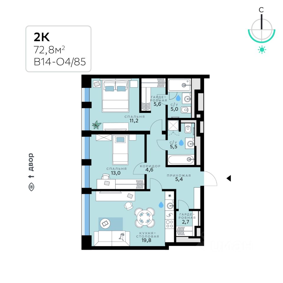 В продаже — двухкомнатная квартира, общей площадью 72,8 кв. м. Квартира расположена на шестом этаже десятиэтажного корпуса Оптимум в квартале В14 нового района СберСити, который строит Сбер.