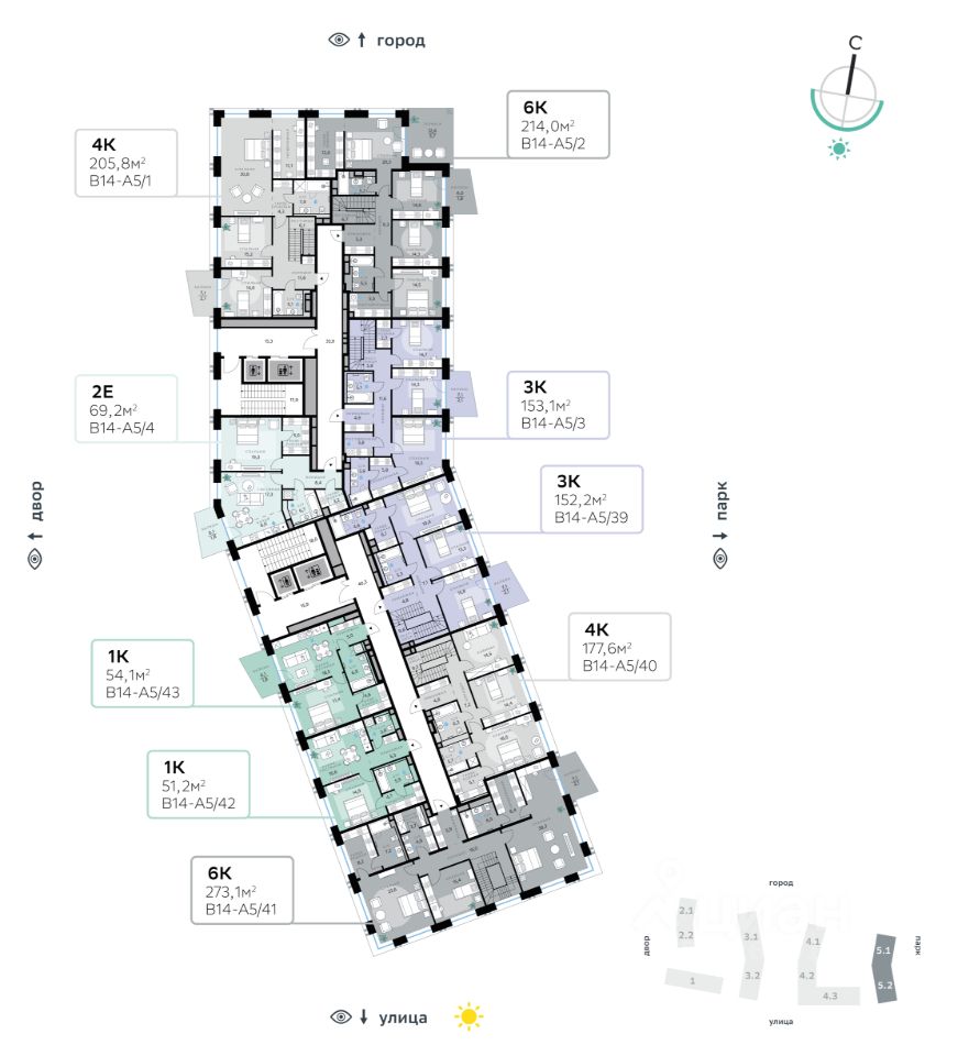 Архитектуру корпусов квартала разработало итальянское бюро. В облике отражена природная палитра: золотисто-бронзовый фасад корпуса Адвансд, выполненный из объёмных металлических элементов со сложным профилем, стал архитектурной доминантой квартала. Из окон открываются панорамные виды на реку и парк. Всего три минуты пешком — и вы на набережной. В14 примыкает к главному парку СберСити.