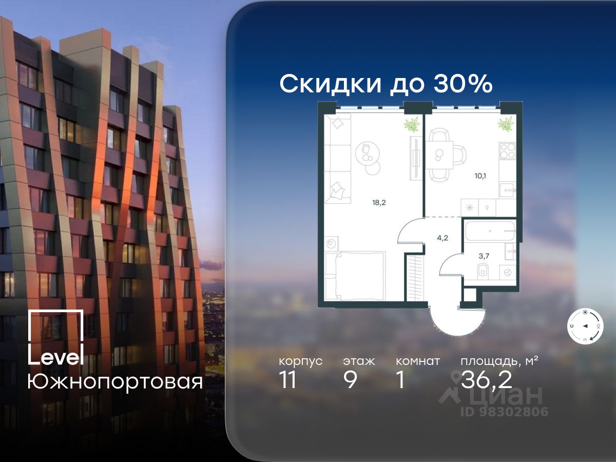 В северной части района Печатники продается 1-комнатная квартира площадью 36.20 кв.м без отделки. Квартира расположена на 9 этаже 16-этажного корпуса 11 в жилом комплексе комфорт-класса Level Южнопортовая (компания Level Group/Левел групп).