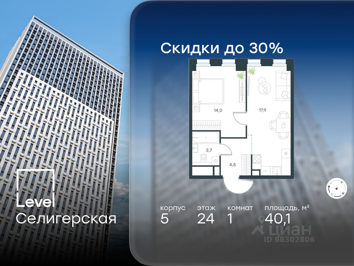 В жилом квартале, расположенном в южной части района Западное Дегунино, продаётся 1-комнатная квартира площадью 40.10 кв.м без отделки. Квартира расположена на 24 этаже 40-этажного корпуса 5 в жилом комплексе комфорт-класса Level Селигерская (компания Level Group/Левел групп).