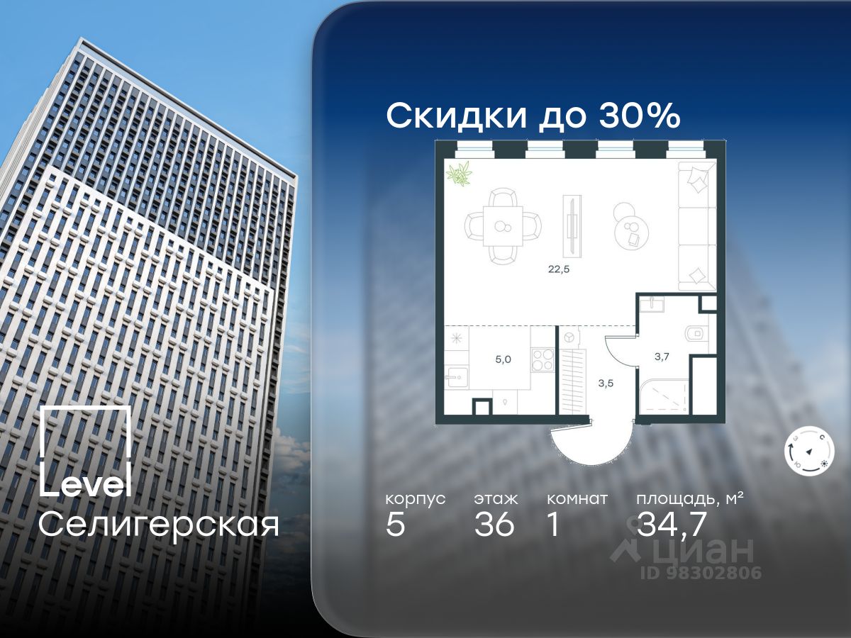 В жилом квартале, расположенном в южной части района Западное Дегунино, продаётся 1-комнатная квартира площадью 34.70 кв.м без отделки. Квартира расположена на 36 этаже 40-этажного корпуса 5 в жилом комплексе комфорт-класса Level Селигерская (компания Level Group/Левел групп).