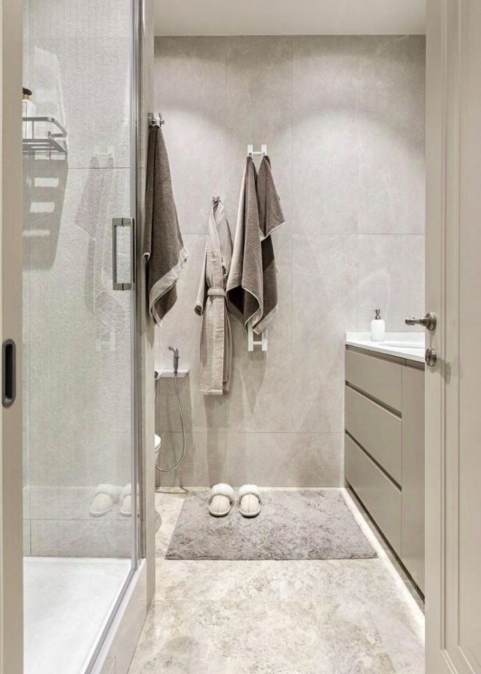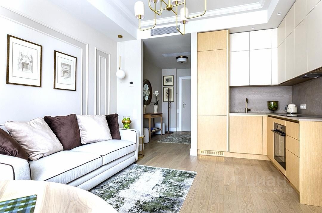 Пространство разделено на гостиную с кухней-столовой, спальню, кабинет/гардеробную, 1 с/у с душевой кабиной.