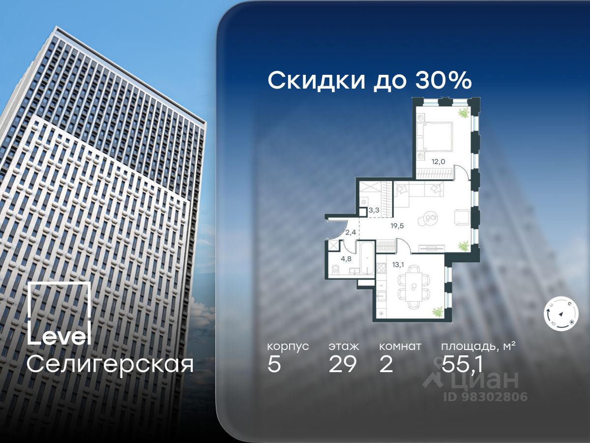 В жилом квартале, расположенном в южной части района Западное Дегунино, продаётся 2-комнатная квартира площадью 55.10 кв.м без отделки. Квартира расположена на 29 этаже 40-этажного корпуса 5 в жилом комплексе комфорт-класса Level Селигерская (компания Level Group/Левел групп).