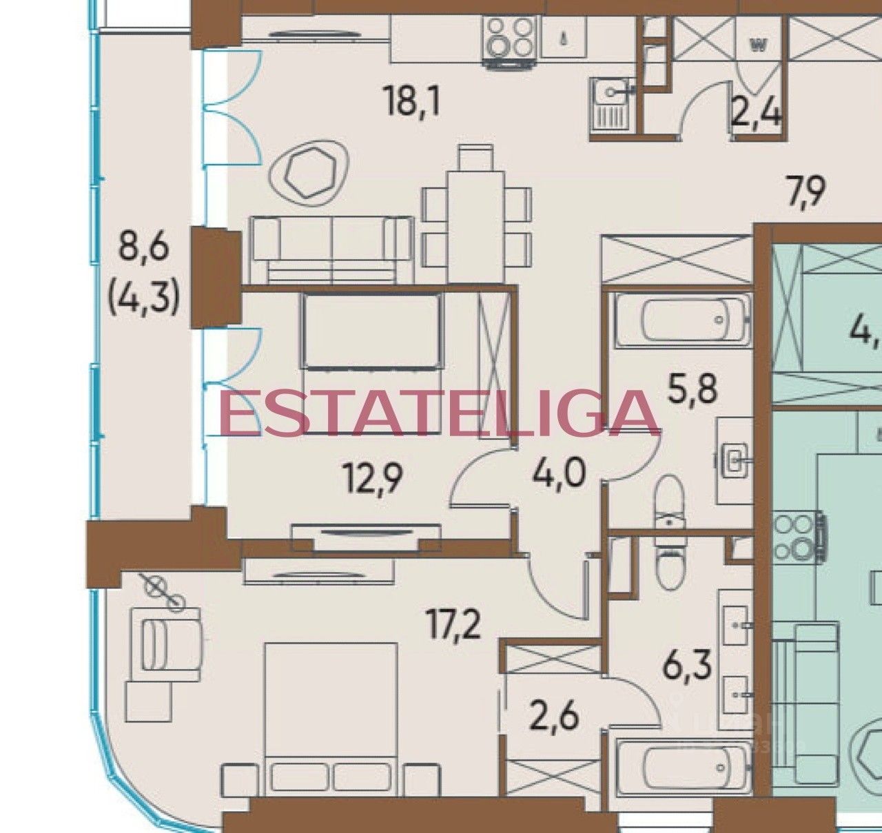 • Внутри вас ждет большая кухня-гостиная . Есть много пространства для дополнительной третьей комнаты. • Большая спальня с собственным санузлом находится в отделении от других комнат. ПРИВАТНОСТЬ И КОМФОРТ ОБЕСПЕЧЕНЫ. • В квартире два санузла.