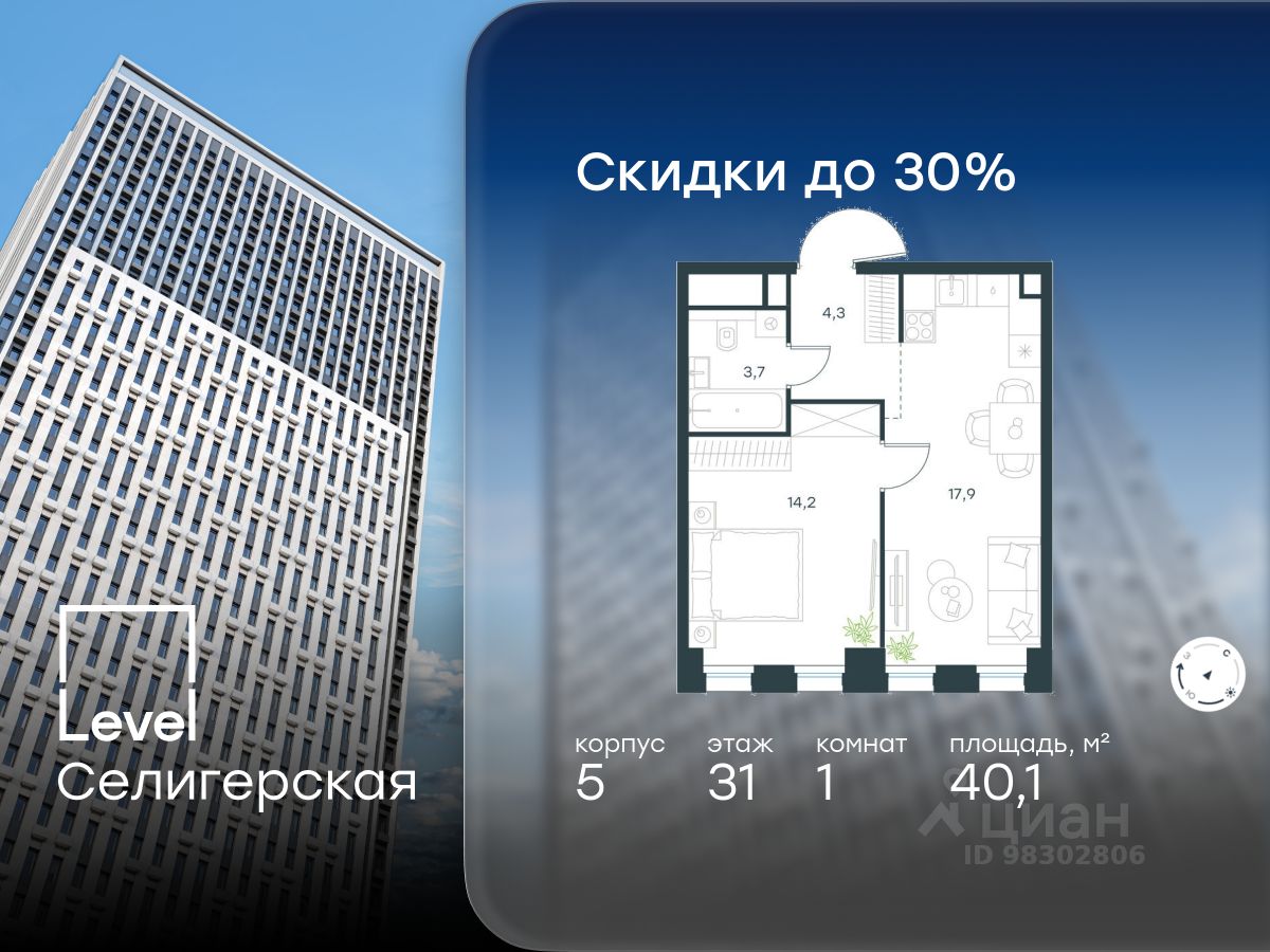 В жилом квартале, расположенном в южной части района Западное Дегунино, продаётся 1-комнатная квартира площадью 40.10 кв.м без отделки. Квартира расположена на 31 этаже 40-этажного корпуса 5 в жилом комплексе комфорт-класса Level Селигерская (компания Level Group/Левел групп).