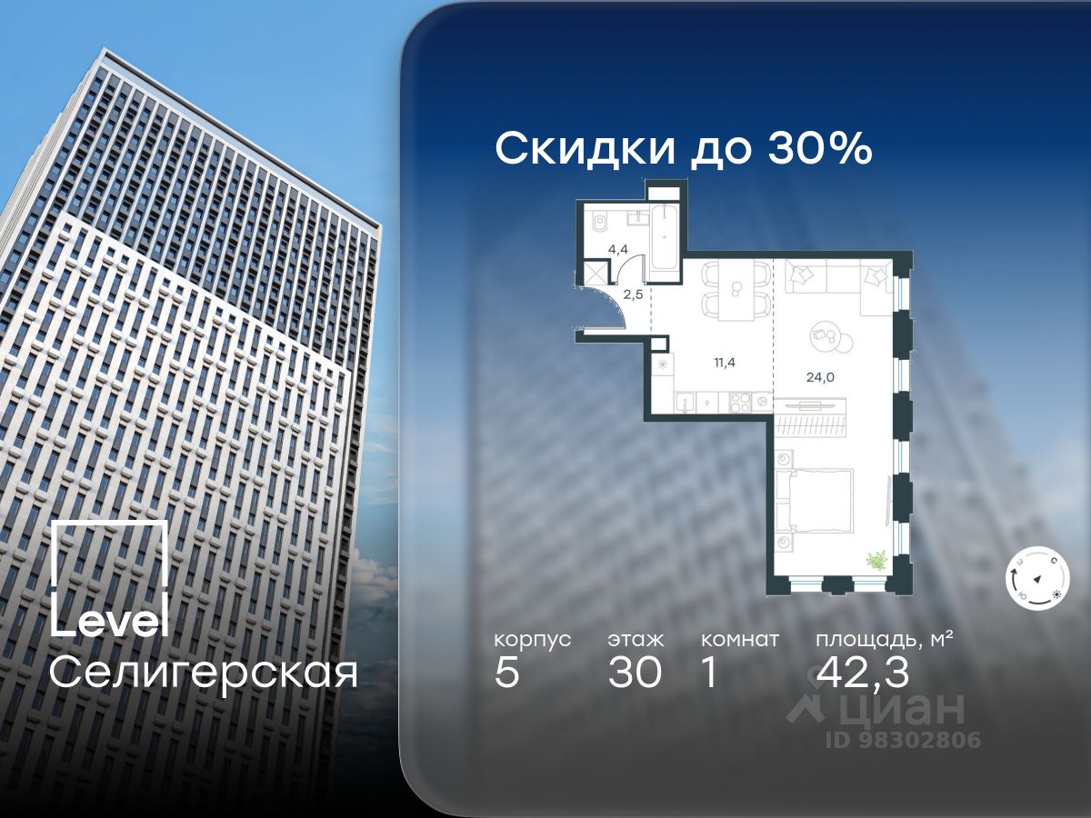 В жилом квартале, расположенном в южной части района Западное Дегунино, продаётся 1-комнатная квартира площадью 42.30 кв.м без отделки. Квартира расположена на 30 этаже 40-этажного корпуса 5 в жилом комплексе комфорт-класса Level Селигерская (компания Level Group/Левел групп).