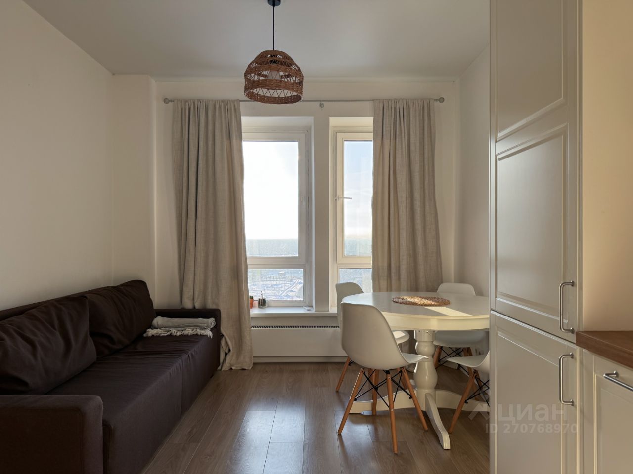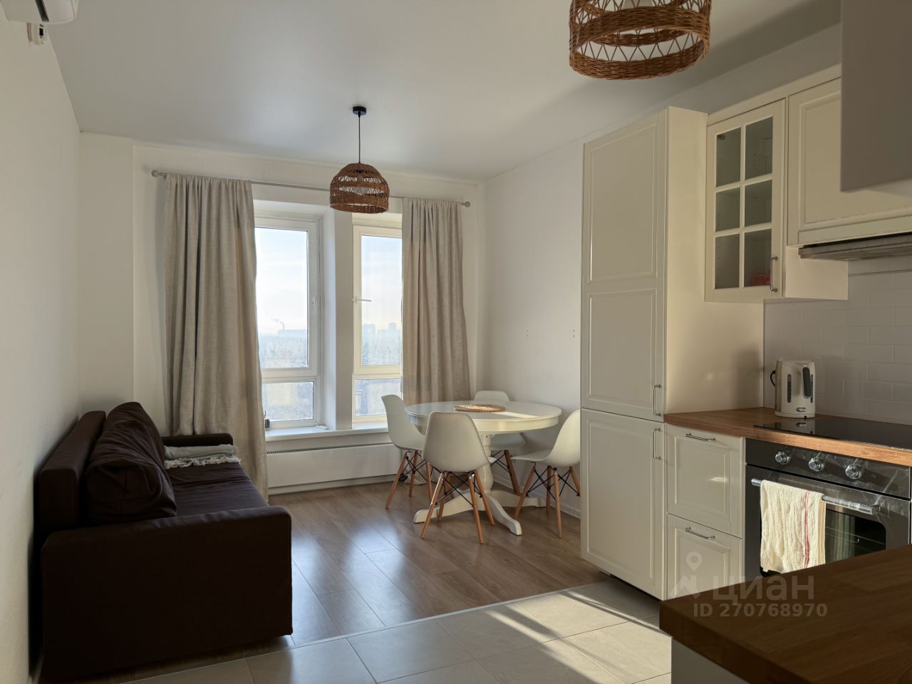 Сдается солнечная евродвушка в Новой Москве. Светлый минималистичный дизайн. Две комнаты: спальня и кухня-гостиная. В спальне просторная двухспальная кровать, рабочий стол, комод для хранения вещей. В гостиной стильная кухня из последних запасов IKEA в приятном молочном цвете с уютными фасадами под винтаж. Раскладной диван. Круглый стол (раскладывается на случай встреч в больших компаниях). В коридоре объемный шкаф для хранения и аккуратная голошница. Общая площадь - 42,3 м2. 14 этаж.