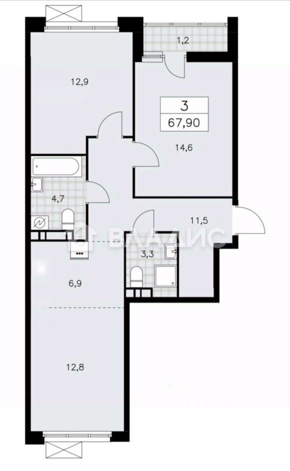 Квартира с изолированными комнатами площадью 12,9 + 14,6 + 12,8 кв. м и кухней 7 кв. м. Простор и функциональность — главные преимущества этой планировки.