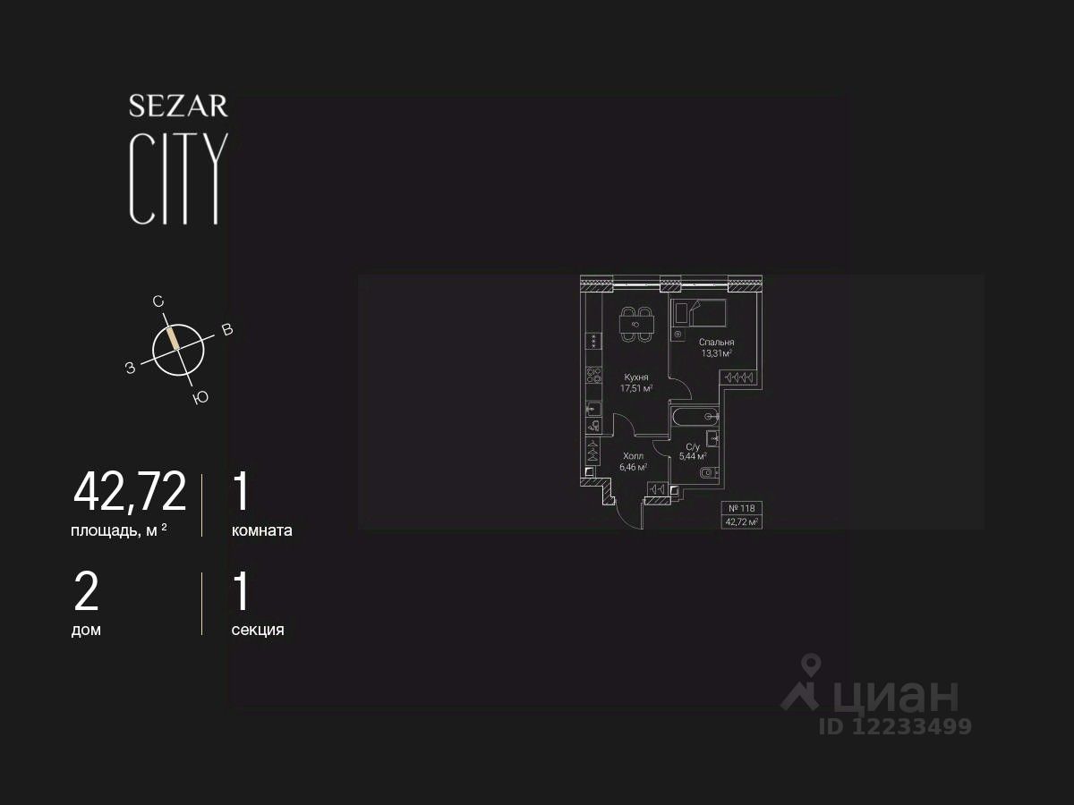 Продается 2-комнатная квартира в ЖК SEZAR CITY на 12 этаже. Общая площадь квартиры составляет 42,72 кв.м. Квартира без отделки. Срок сдачи - 2027 год.