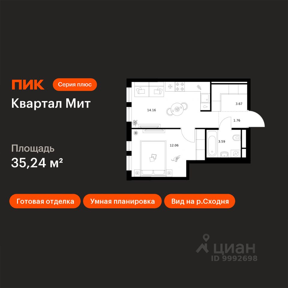 Новостройка! Продается 1-комн. кв-ра площадью 35,24 кв.м, (Корпус 3.4, Секция 4) 13 этаж 32-этажного дома в Квартал Мит от ПИК. ''Квартал Мит'' строится в экологически чистом районе Митино, где по соседству расположен большой лесопарк, а с двух сторон протекают реки Сходня и Журавка. Для семей с детьми здесь появится школа и два детских сада. В 20 минутах пешком находится станция метро ''Пятницкое шоссе'', а за 10 минут на автомобиле можно доехать до МКАД.