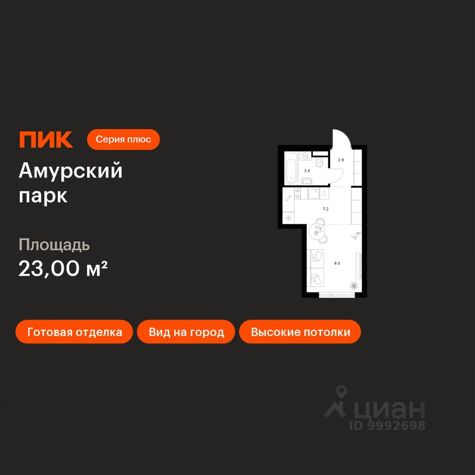 Продаётся квартира-студия площадью 23 кв.м на 27 этаже 27 этажного дома (Корпус 4.5, Секция 6) проекта ПИК Амурский парк. Светлый просторный подъезд на уровне земли, функциональная планировка, большие окна, c отделкой.