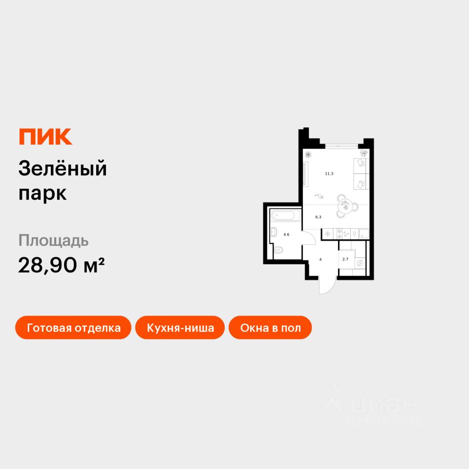 Продаётся квартира-студия площадью 28,9 кв.м на 5 этаже 28 этажного дома (Корпус 5.4, Секция 5) проекта ПИК Зелёный парк. Светлый просторный подъезд на уровне земли, функциональная планировка, большие окна, c отделкой.