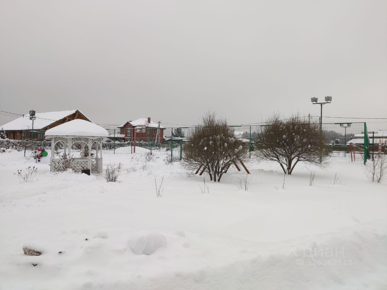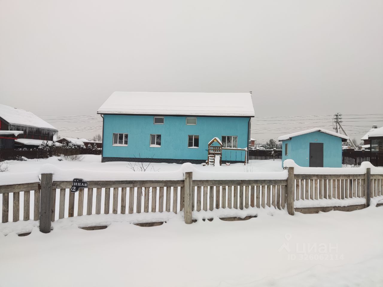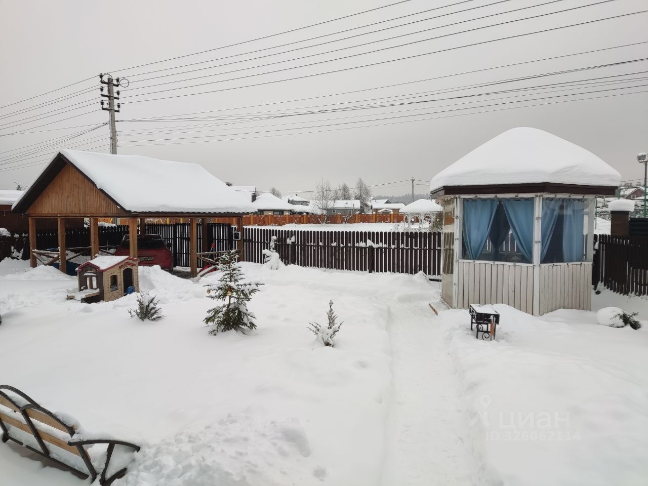 Участок большой, 14 соток, расположен в центре поселка, напротив пруда. На участке есть детская горка с качелями и песочницей, навес под машину с чердаком, беседка для отдыха, отдельное помещение для водной скважины, 6 грядок.